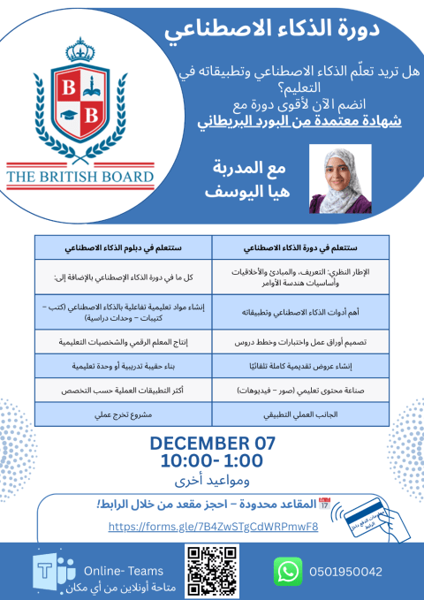 تعلم خفايا وأسرار الذكاء الاصطناعي في دبلوم الذكاء الاصطناعي واحصل على شهادة معتمدة من البورد البريطاني ستتعلم كيفية اعداد الدروس والعروض التقديمية وتوليد الصور والفيديوهات بأقل وقت ممكن الدروس التفاعلية والاختبارات الدورة اونلاين من أي مكان