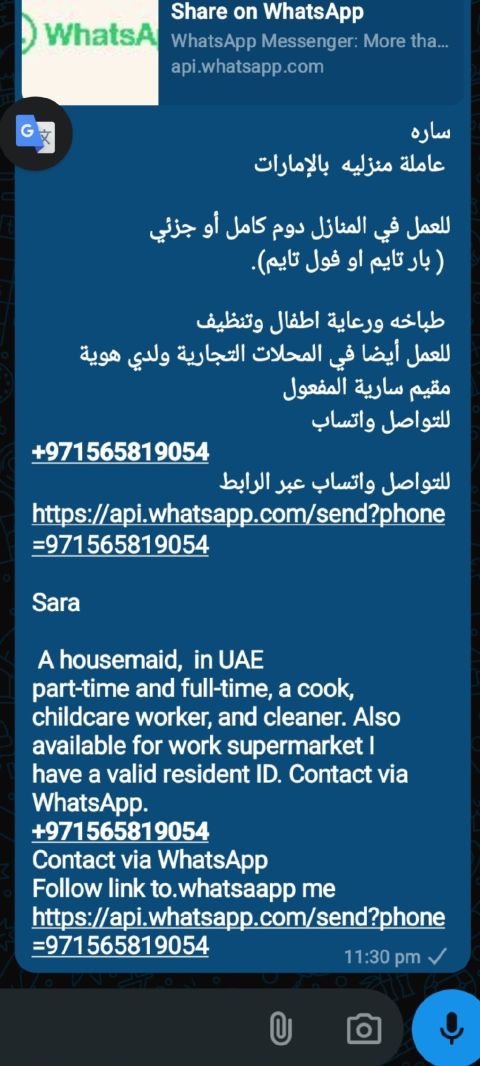ساره عاملة منزلية في الامارات للعمل في المنازل دوم كامل أو جزئي (بار تايم أو فول تايم) طباخه ورعاية اطفال وتنظيف للعمل أيضا في المحلات التجارية ولدي هوية مقيم سارية المفعول