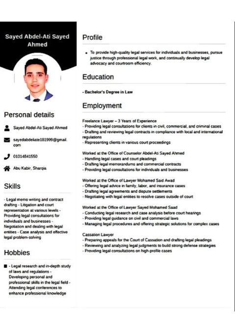 Egyptian lawyer looking for work with experience in laws, writing initial papers, civil, commercial, labor, rental, and criminal memoranda, personal status matters, interpreting civil contracts, responding and commenting on expert and arbitrator reports, objecting to rulings, writing appeals, implementation issues, checks, and all types of appeals. I have more than 5 years of experience in Egypt