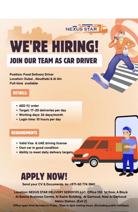 URGENT Hiring Car drivers in Al Ain. Delivery job, candidates must have own car and own Visa. AED11/ delivery. 13 - 15 deliveries daily. Location available are 1. Al Mutarid 2. Al Nassrreya 3. Waha Mall 4. souq Extra