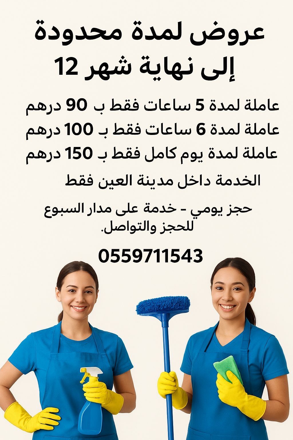 عروض لمدة محدودة الى نهاية شهر 12 عاملة لمدة 5 ساعات فقط ب 90 درهم عاملة لمدة 6 ساعات فقط ب 100 درهم عاملة لمدة يوم كامل فقط ب 150 درهم الخدمة داخل مدينة العين فقط حجز يومي