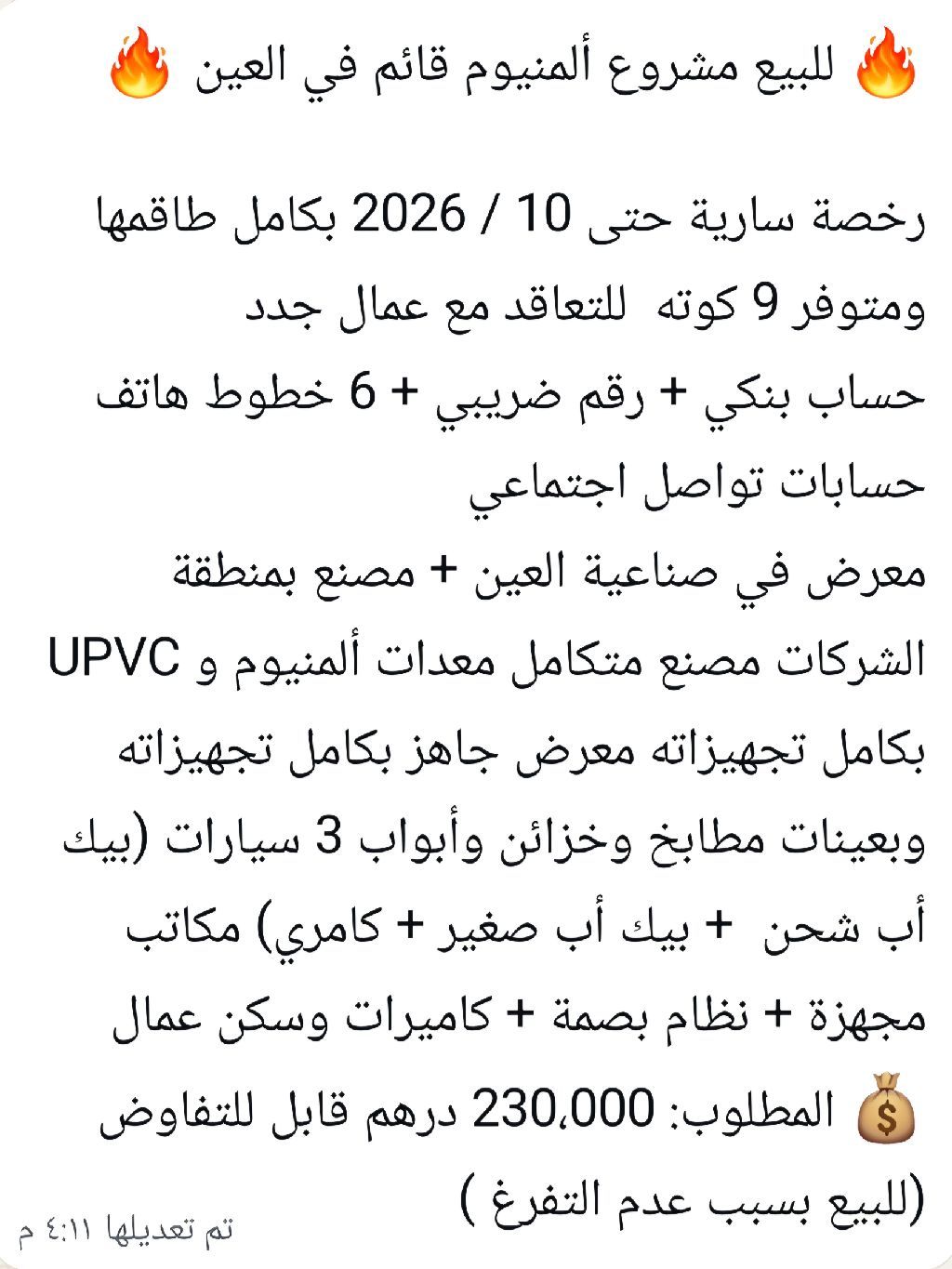 رخصة تجارية لأعمال الألومينيوم سارية حتى 10 / 2026 بكامل طاقمها ومتوفر 9 كوته للتعاقد مع عمال جدد حساب بنكي + رقم ضريبي + 6 خطوط هاتف يوجد معرض ومصنع للرخصة بكامل تجهيزاته في مدينة العين و3 سيارات ومكاتب مجهزة + نظام بصمة + كاميرات وسكن عمال المطلوب 230000 درهم قابل للتفاوض (للبيع بسبب عدم التفرغ)