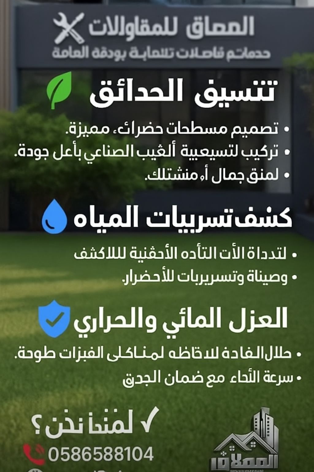 Al - Amlaq Contracting and General Maintenance Company We offer comprehensive services with high quality and precision to meet all your needs Landscaping Designing distinctive green spaces. Installing artificial and natural grass with the highest quality. Landscape design that adds a touch of beauty to your home or facility. Water Leak Detection Using the latest technical equipment