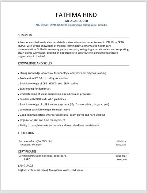 أنا فاطمة هند، خريجة حديثة في مجال الترميز الطبي. اعمل حاليا في الامارات العربية المتحدة ضمن برنامج تدريب عملي. أنا طبية متخصصة، مدربة على أنظمة ICD 10cm وCPT وHCPCS، ولدي معرفة واسعة بالمصطلحات الطبية وعلم التشريح وتوثيق الرعاية الصحية. لدي خبرة في تقديم التقارير الطبية واعادة تقديمها، والم بارشادات وزارة الصحة وهيئة الصحة في أبوظبي. أنا على استعداد للعمل فورا