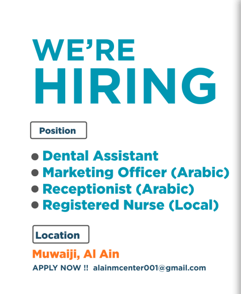 WE ARE HIRING Position Dental Assistant Marketing Officer Receptionist (Arabic) Registered Nurse (Local) In a Medical Center in Al Ain