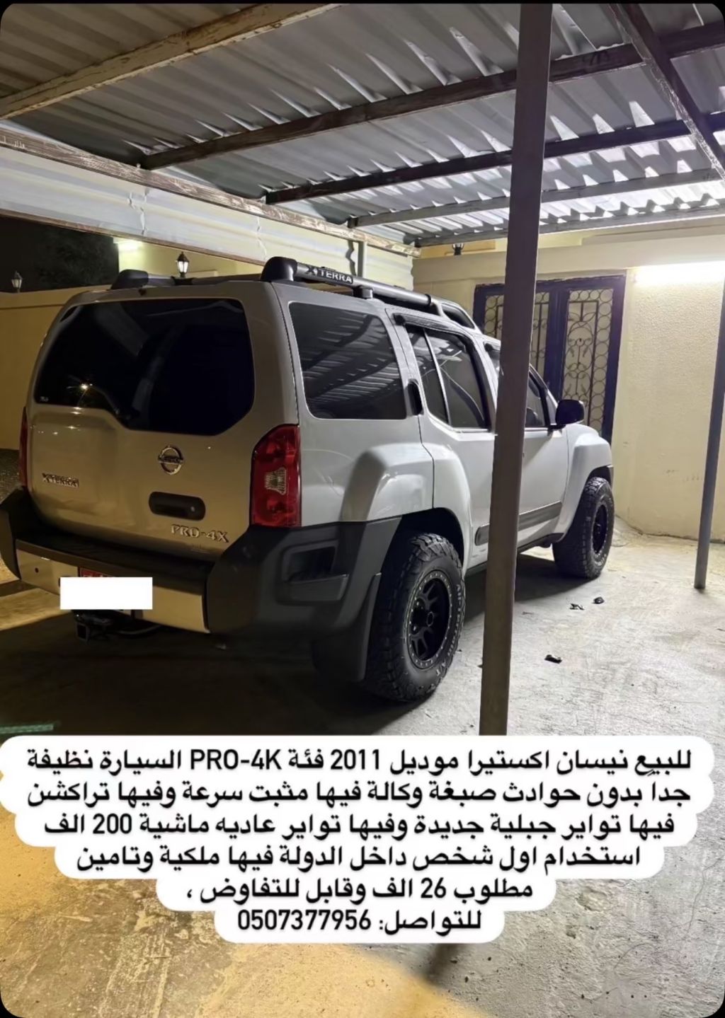 للبيع: نيسان أكستيرا موديل 2011، فئة برو - دفع رباعي. السيارة بحالة ممتازة، خالية من الحوادث، طلاء الوكالة. تتضمن مثبت سرعة، نظام التحكم في الجر، إطارات جبلية جديدة وإطارات عادية. المسافة المقطوعة: 200,000 كم، مالك أول داخل الدولة. يشمل السعر الملكية والتأمين. السعر: 26,000 درهم إماراتي قابل للتفاوض.