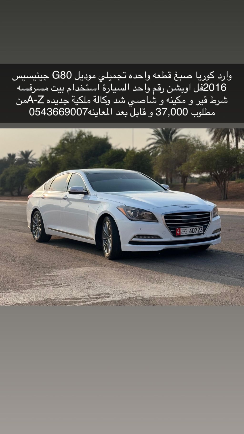 Genesis G80 imported from Korea, single piece cosmetic paint, 2016 model, full options, number one car. The car has been used for home purposes and maintained from A to Z. Condition: transmission, engine, and chassis are excellent. Agency ownership, new ownership. Asking price: 37,000 and negotiable after inspection.