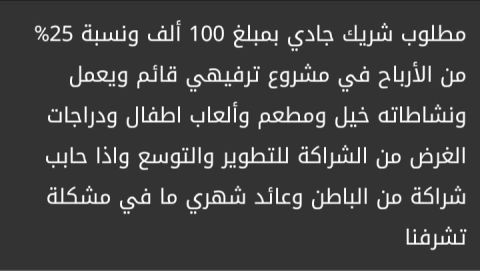 مطلوب شريك جاد ممول لمشروع مربح جدا وقائم بقيمة 15 ألف وارجاع المبلغ خلال شهر 25 ألف مكسب 80% أرجو من الجاد التواصل والمشروع مستمر والمشروع تجارة مواد غذائية