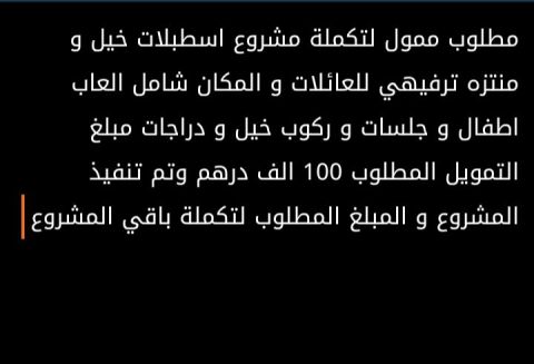 مطلوب ممول لتكملة مشروع اسطبلات خيل ومنتزه ترفيهي للعائلات والمكان شامل ألعاب اطفال وجلسات وركوب خيل ودراجات مبلغ التمويل المطلوب 100 ألف درهم وتم تنفيذ المشروع والمبلغ المطلوب لتكملة باقي المشروع