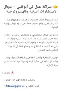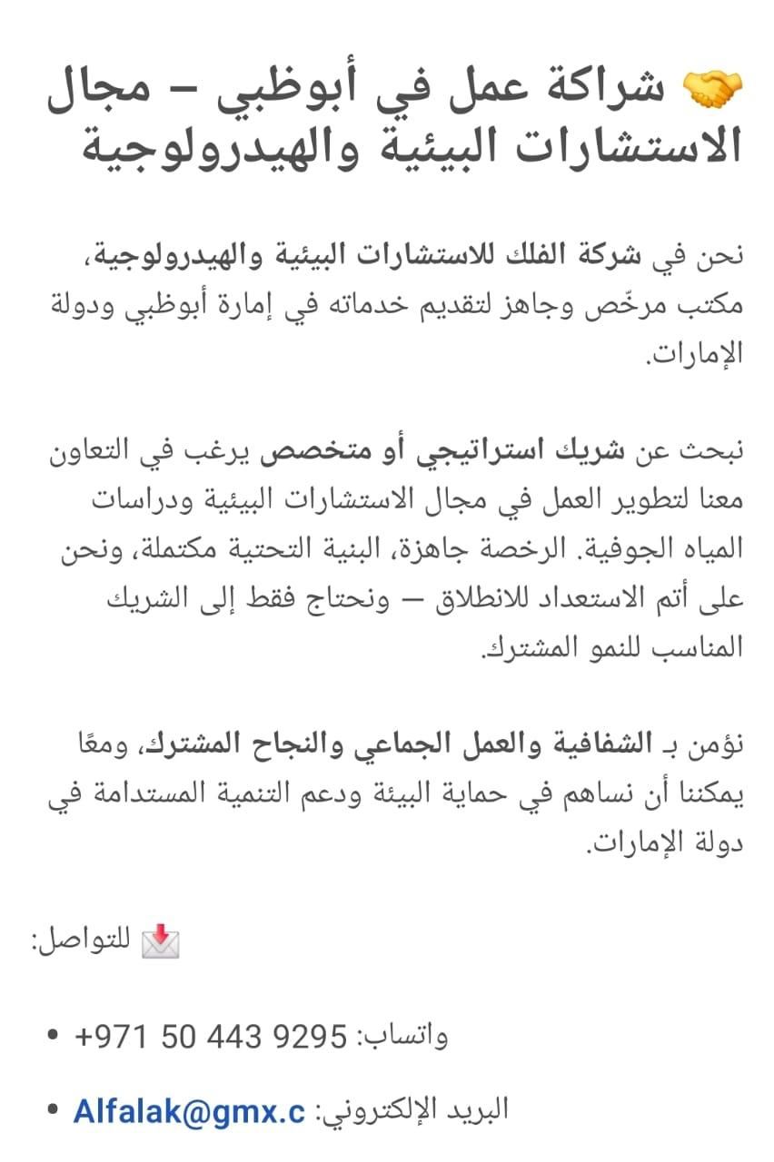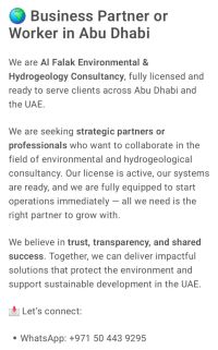 Business Partner or worker in Abu Dhabi We are Al Falak Environmental & Hydrogeology Consultancy, licensed and ready to serve clients across Abu Dhabi and the UAE. We are reaching out today to connect with professionals or companies who are interested in a strategic partnership within the environmental and hydrogeological consulting field. Our license is active, our systems are ready, and we are fully