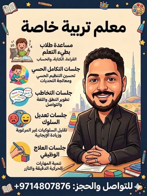 معلم تربية خاصة متخصص في دعم الطلاب بطيء التعلم على القراءة والكتابة والحساب وتقييم طلاب ذوي الهمم ووضع الخطة المناسبة لكل طالب من جلسات علاج وظيفي وجلسات تكامل حسي وجلسات تخاطب وجلسات تعديل سلوك والتعاون مع ولي الأمر ومساعدته على كيفية التعامل مع الطالب بشكل صحيح