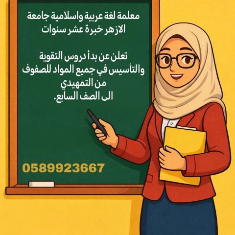 معلمه لتدريس جميع المواد من التمهيدي الى الصف الثامن ومراجعة ما قبل الاختبارات خبرة عشر سنوات