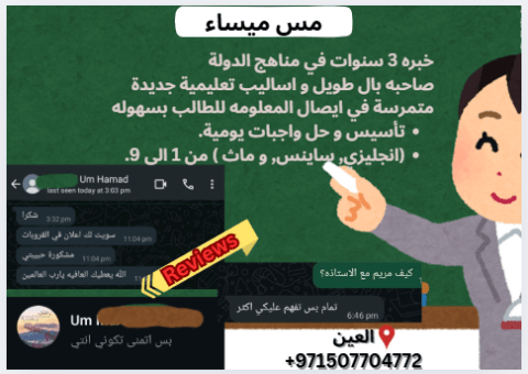 مدرسة لبنانية لجميع المراحل الدراسية وجميع المواد ولدي خبرة في جميع المناهج (عربي، بريطاني وأمريكي) في مدينة العين لمن يهمه الأمر يرجى التواصل على الرقم