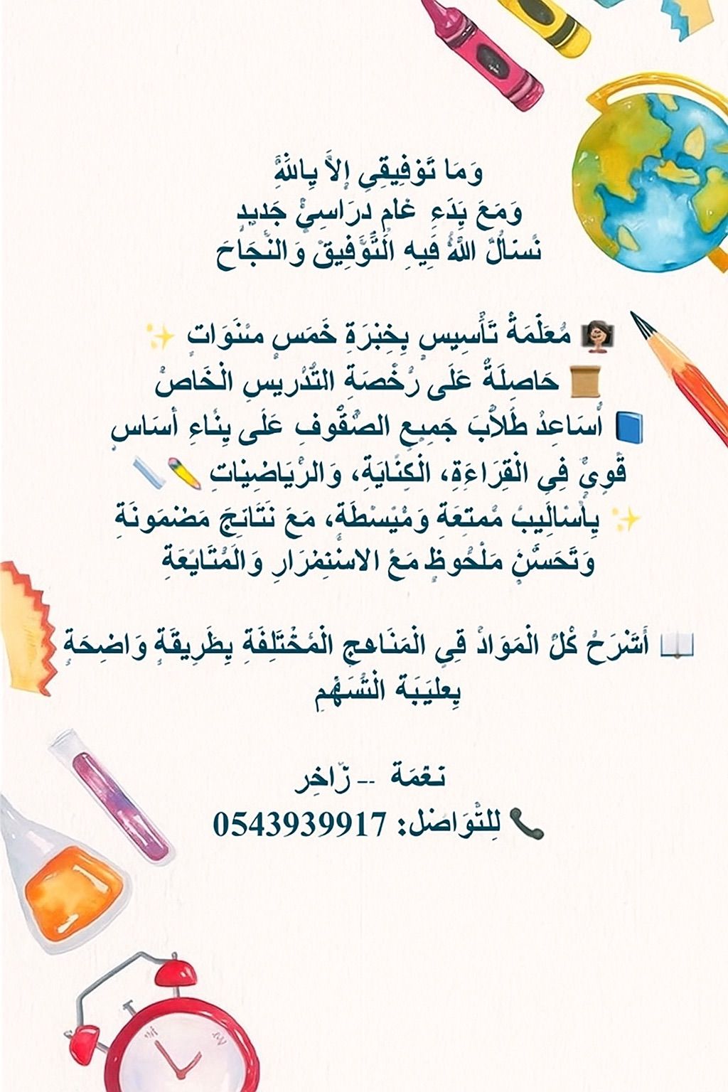 معلمة للتأسيس للغة العربية واللغة الانجليزية وتدريس كافة المواد لكل المراحل خبرة أكثر من 5 سنوات موجودة في نعمة وزاخر