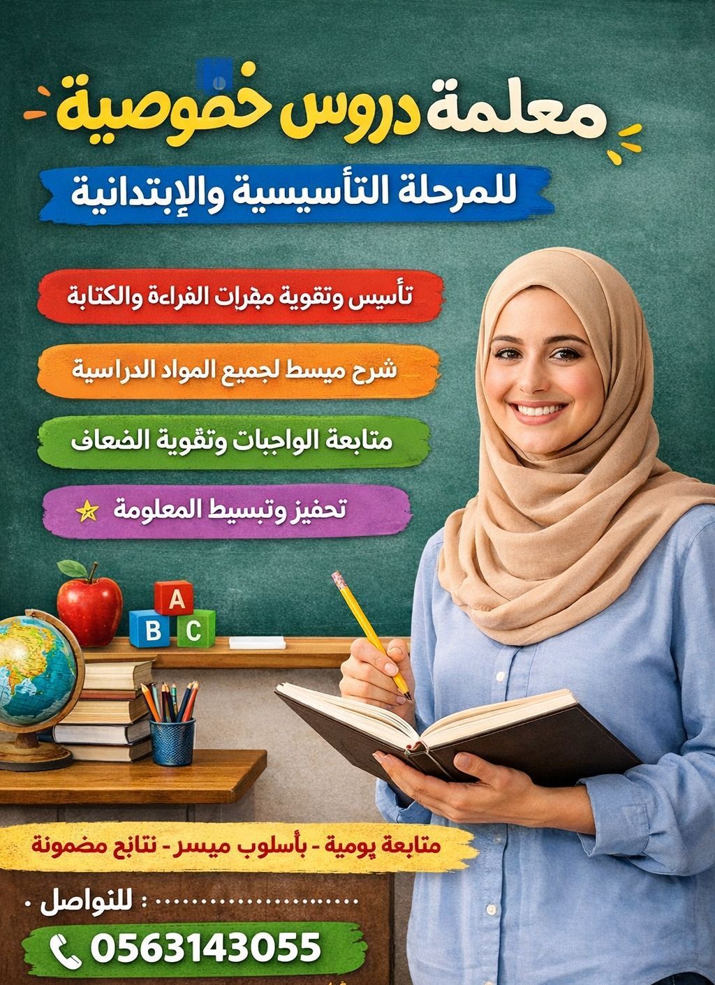 معلمة دروس خصوصية متابعة يومية وحل الواجبات وتأسيس الطلاب في القراءة والكتابة والرياضيات
