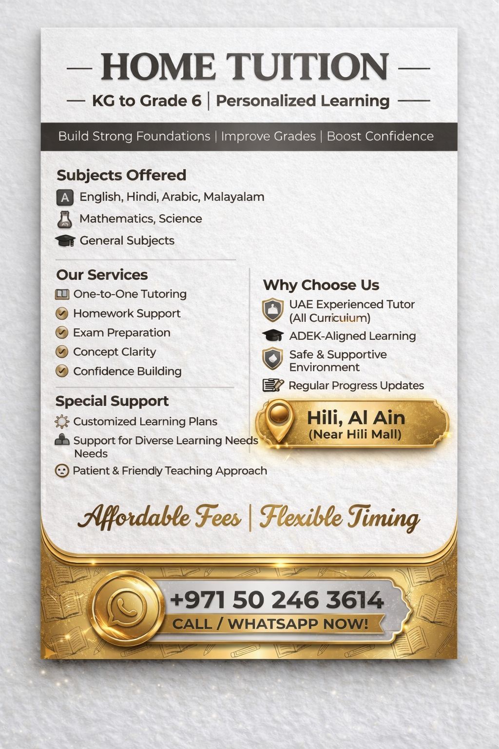 HOME Tuition (KG - Grade 6) Subjects English, Hindi, Arabic, Malayalam, Math, Science, General Studies Services One - to - One Tutoring Homework Help Exam Preparation Concept Clarity Special Support Customized Learning Plans Patient Teaching Learning Support for All Needs UAE Experienced Tutor ADEK - Aligned Approach Progress Updates