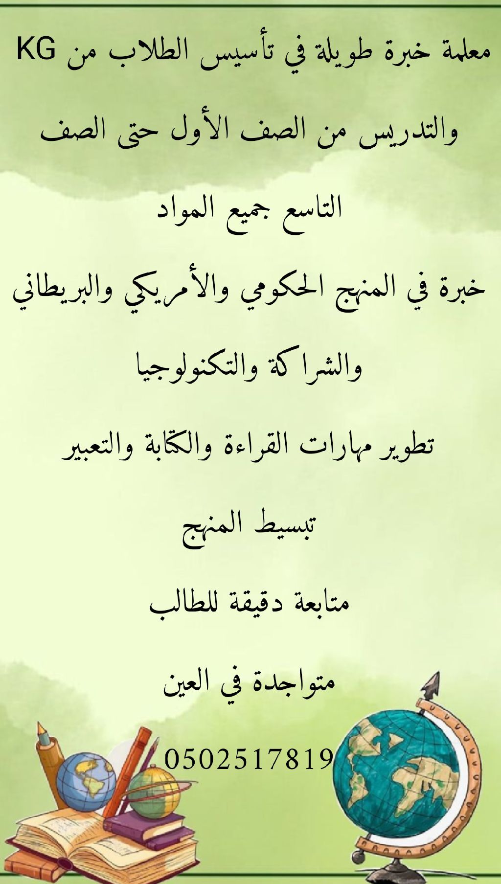 معلمة مصرية خبرة طويلة في التأسيس وتدريس جميع المواد من الصف الأول حتى الصف التاسع جميع المناهج حكومي، أمريكي، بريطاني، شراكة، ليوا، شويفات، تكنولوجيا، تطبيقية. اعمل على تطوير مهارات القراءة والكتابة والتعبير. تبسيط المنهج. متابعة دقيقة مع الطالب. متواجدة في العين
