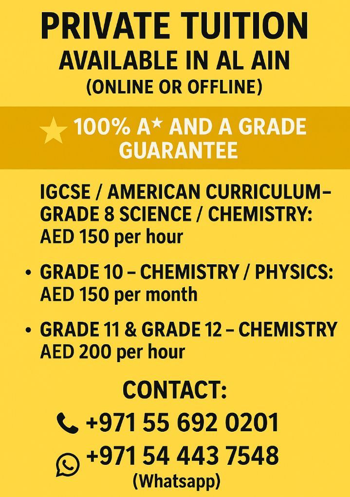 Private tuition available in Al Ain (online or offline) 100% A and A grade guarantee IGCSE/ American Curriculum - Grade 8 Science/ Chemistry AED150 per hour Grade 10 - Chemistry/ Physics AED150 per month Grade 11 & Grade 12 - Chemistry AED200 per hour Contact