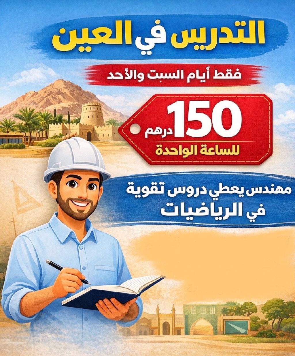 مهندس يقدم دروس تقوية في مادة الرياضيات لطلاب الصف الثالث حتى الصف التاسع. شرح مبسط، صبر في التعامل، وتركيز على فهم الطالب وتقوية الأساسيات. التدريس داخل بيت الطالب (في العين) فقط أيام السبت والأحد - حصص فردية (طالب واحد) 150 درهم للساعة الواحدة - مناسب للطلاب الضعفاء أو اللي يحتاجوا متابعة خاص
