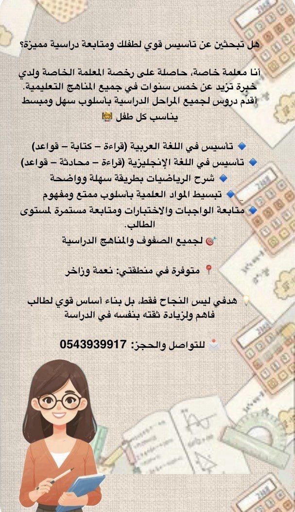 معلمة خاصة، حاصلة على رخصة المعلمة الخاصة ولدي خبرة تزيد عن خمس سنوات في جميع المناهج التعليمية. أقدم دروس لجميع المراحل الدراسية بأسلوب سهل ومبسط يناسب كل طفل