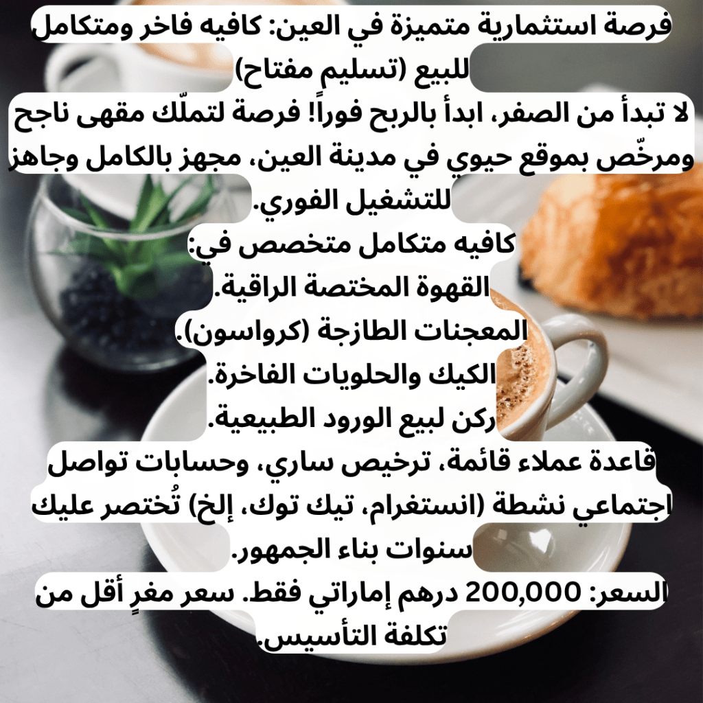 Golden Investment Opportunity A luxurious and fully integrated café for sale in the heart of Al Ain Don't start from scratch. Start making profits immediately We offer you the opportunity to own a successful café with a unique license in a prime location in Al Ain, ready for immediate operation and expansion. The project adopts the concept of a fully integrated café specializing in high - end specialty