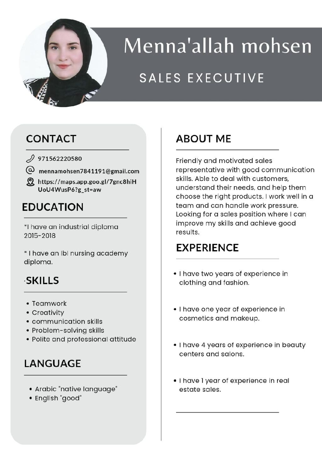 خبرة في المبيعات 5 سنوات وسيلز أريد عمل في المبيعات أو مطعم السن 24 سنة حسنة المظهر متواجدة في العين