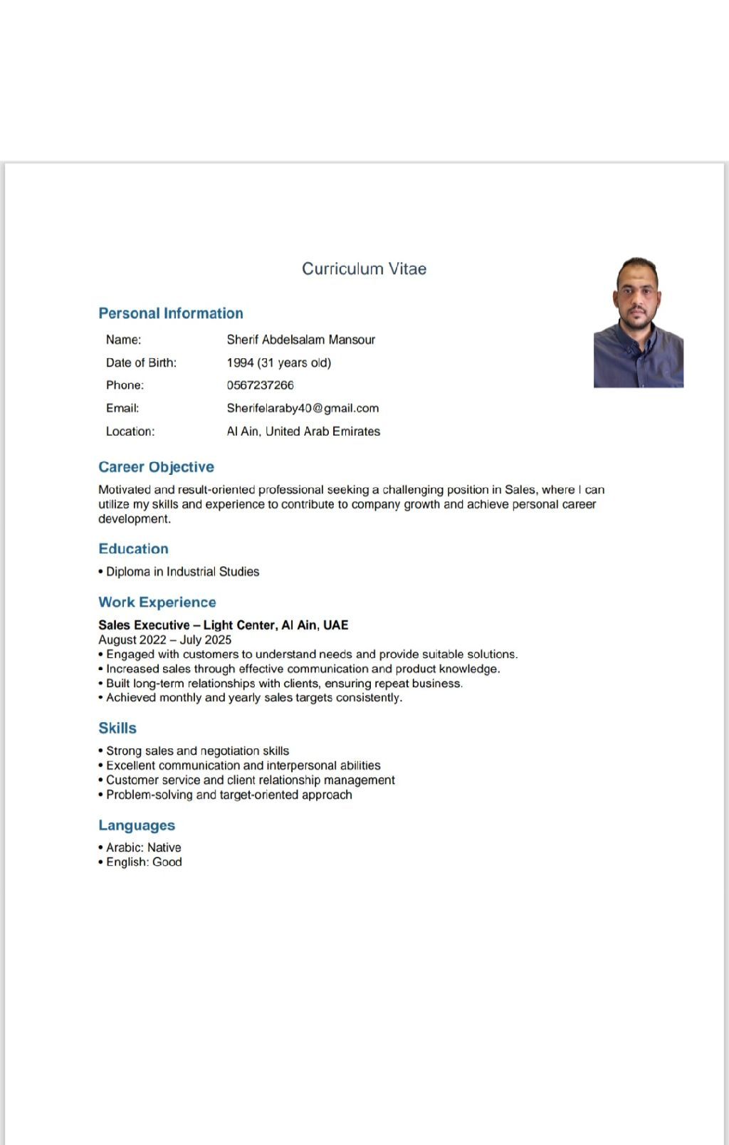 Looking for a sales job opportunity in the UAE. I have strong experience in customer relations, achieving sales targets, and providing high - quality service that enhances the organizations'reputation. I possess excellent communicatio skills, a strong ability to persuade, and the ability to work within a team to achieve the best results. Ready to join immediately, and