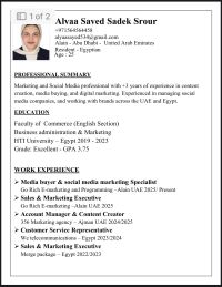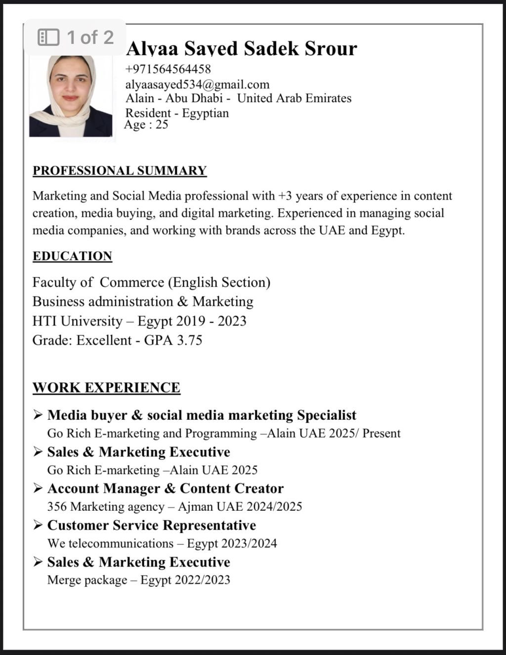 ابحث عن عمل أنا مقيمة في الامارات في العين ولدي خبرة داخل الدولة في المبيعات وخدمة العملاء والأعمال الاداريه والتسويق الالكتروني وادارة حسابات السوشيال ميديا. متاحه للعمل فورا وأتميز بالانضباط وسرعة التعلم والعمل تحت ضغط