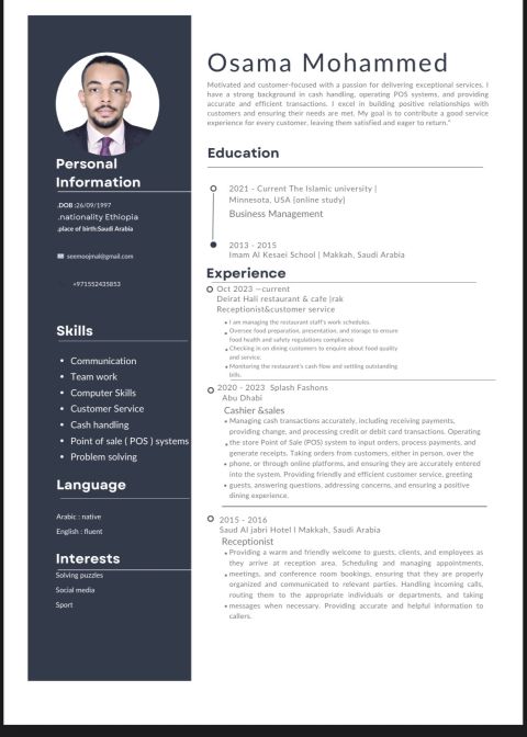 أنا أسامة مواليد السعودية أتحدث اللغة العربية والانجليزية (اللهجة الخليجية) لدي خبرة مبيعات وخدمة عملاء خبرتي في الامارات وفي السعودية