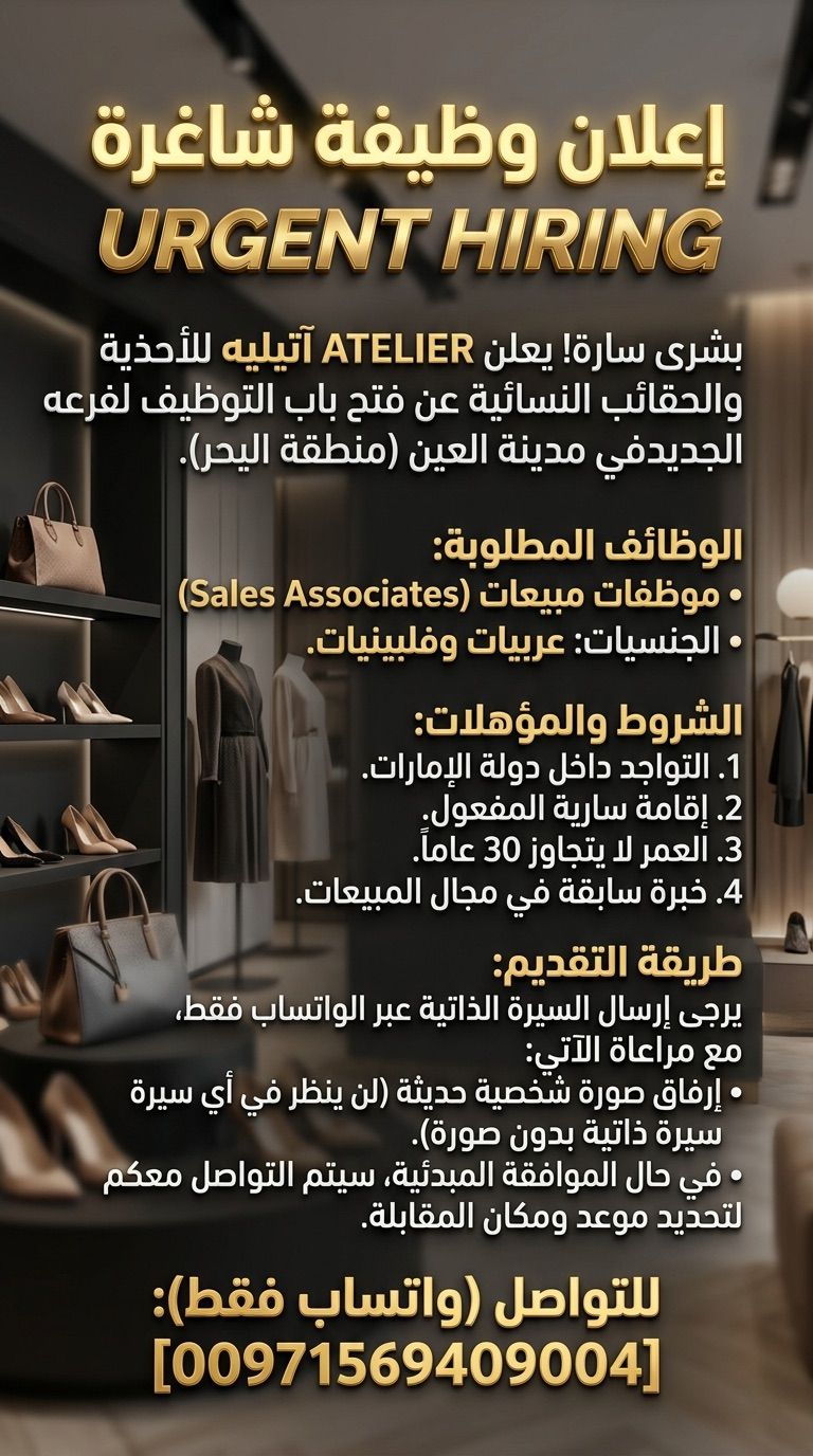 بشرى سارة يعلن Atelier أتيلية للأحذية والحقائب النسائية عن فتح باب التوظيف لفرعه الجديد في مدينة العين (منطقة اليحر) الوظائف المطلوبة موظفات مبيعات (Sales Associates) الجنسيات عربيات وفلبينيات. الشروط والمؤهلات التواجد داخل دولة الامارات إقامة سارية المفعول العمر لا يتجاوز 30 عاما خبرة سابقة في مجال المبيعات يرجى إرسال السيرة الذاتية عبر
