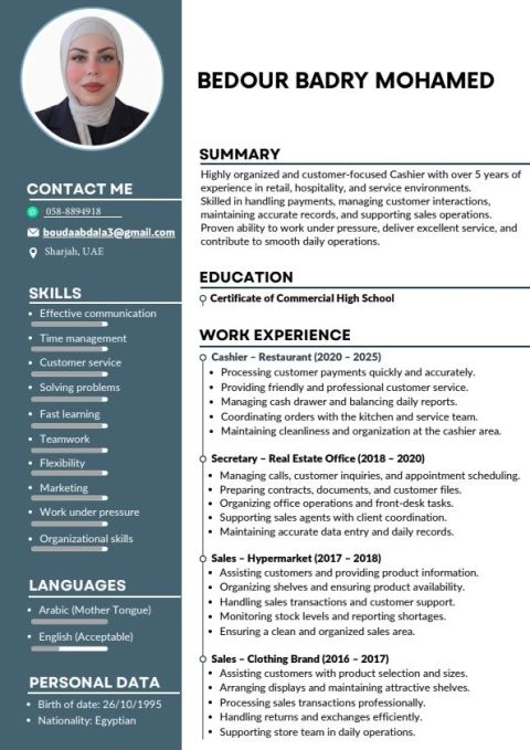 جميعا الاسم / رية أم سعيد الجنسية / مصريه العمر / 29 سنة بفضل الله المؤهل / بكالوريوس تجارة العنوان / الشارقة النهدة اللغة / 30% محجبة الخبرات / اشتغلت كاشير 3 سنوات في مصر في هايبر زاي / اشتغلت استقبال ب مركز طبي سنتين في مصر اشتغلت استقبال في جيم في الشارقة لمدة 6 أشهر الجيم كان عام لي إقامة وحاليا أنا معيا فترة سماح شهر وبدور على شغل ياريت الى قدامه شغل ليا يكون شاكر