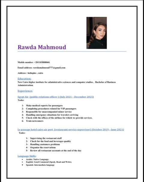 Make medical reports for passengers Completing procedures related for VIP passengers 3 - Responsible for unaccompanied minor service 4 - Handling emergency situations for travelers arriving 5 - Check with the offices of the airlines for which we provide services. 6 - Train newcomers Le passage hotel cairo airport restaurant service supervisor) October 2019 - June 2021) Tasks 1 - Supervising the restaurant