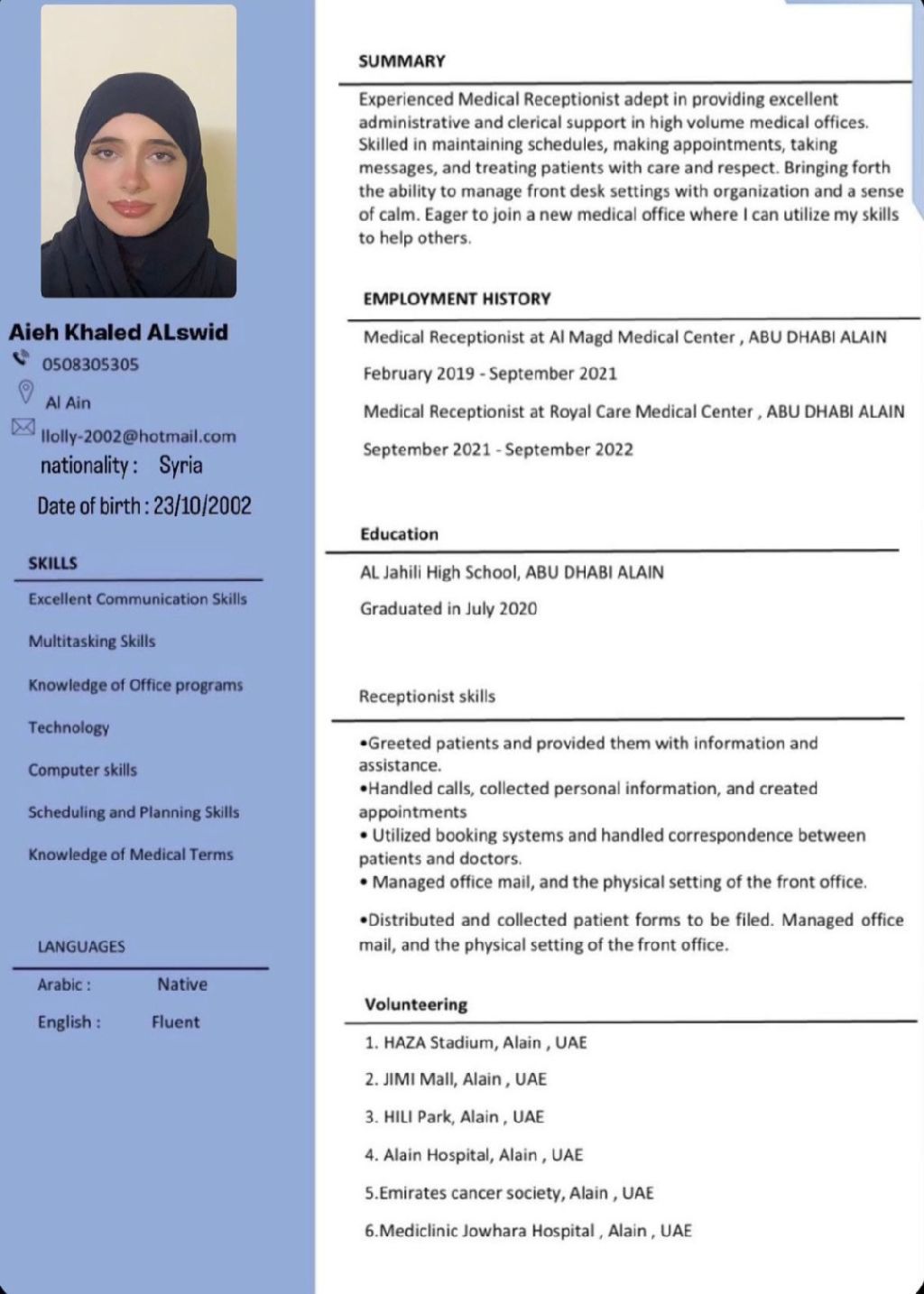 ابحث عن عمل فيه مدينة العين ولدي خبرة فيه الاستقبال والكول سنتر ولدي اقامة وسوريه الجنسية
