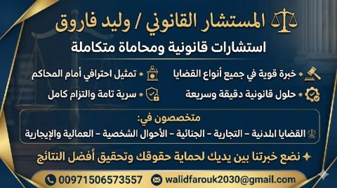 أعرف نسبة نجاح قضيتك بكل مصداقية. مستشار قانوني خبرة 25 عاما في كافة فروع القانون. جنائي. مدني. تجاري. أحوال شخصية. عمالي. شركات. مقاولات. أخطاء طبية. إيجارات. كتابة عقود ومذكرات. أبوظبي