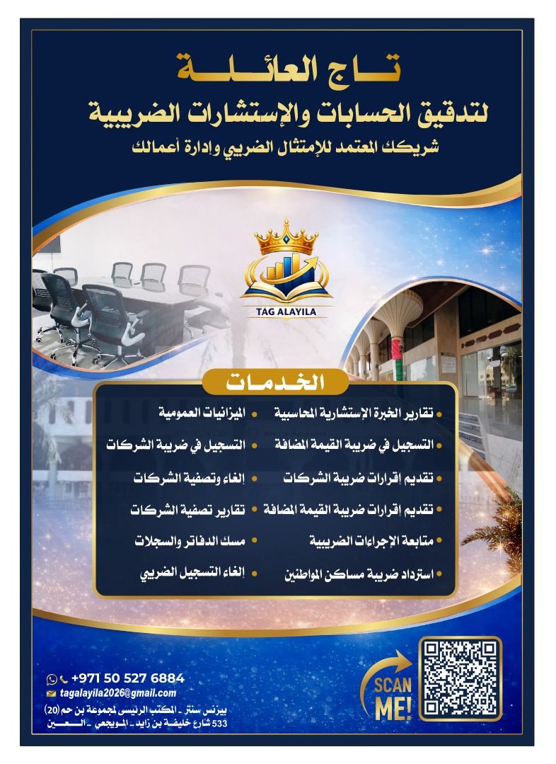 تاج العائلة لتدقيق الحسابات والاستشارات الضريبية متخصصون في كافة الخدمات المحاسبية والضريبية (الميزانيات المدققة - التقارير الاستشارية - محاسب دوام جزئي - التسجيل والالغاء وتقديم الاقرارات في ضريبة القيمة المضافة وضريبة الشركات)
