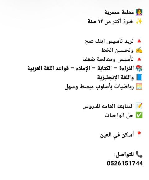 معلمة تدريس من صف أول صف خامس تأسيس موجودة في العين جاهزه في أي وقت