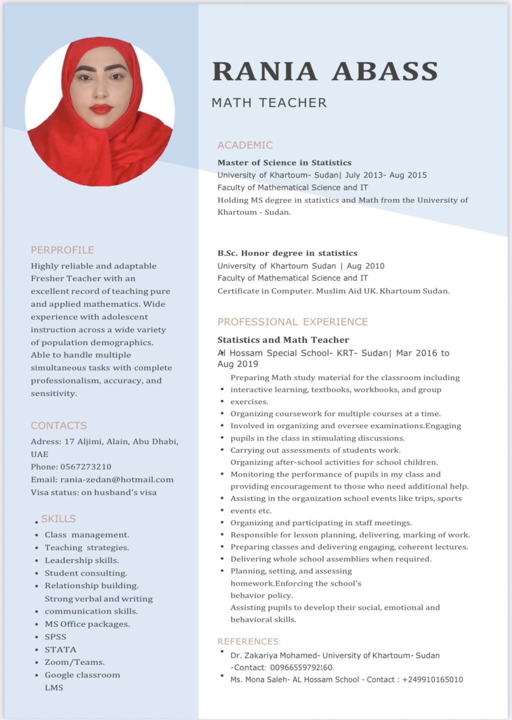 معلمة حاصلة على درجة الماجستير في الرياضيات أقوم بتدريس جميع المراحل والمناهج الحكومية والعسكرية والتطبيقية والبريطانية والأمريكية، وتدريس المراحل الجامعية لمواد الكالكلوس والمعادلات التفاضلية والجبر ود سيكوريت ماث