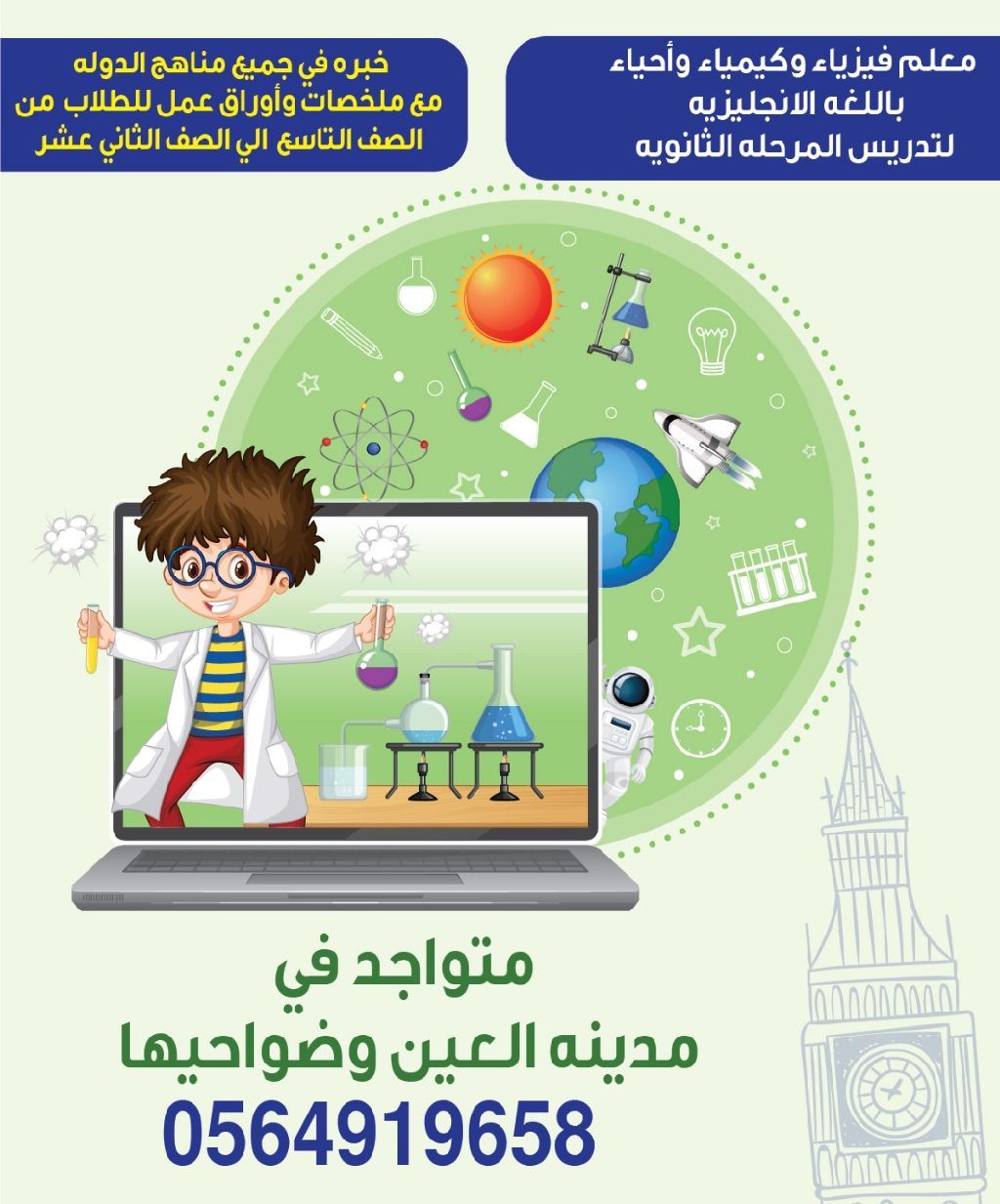 معلم فيزياء وكيمياء وأحياء باللغة الانجليزية لتدريس المرحلة الثانوية خبرة في جميع مناهج الدولة مع ملخصات وأوراق عمل للطلاب من الصف التاسع الى الصف الثاني عشر متواجد في مدينة العين وضواحيها للتواصل