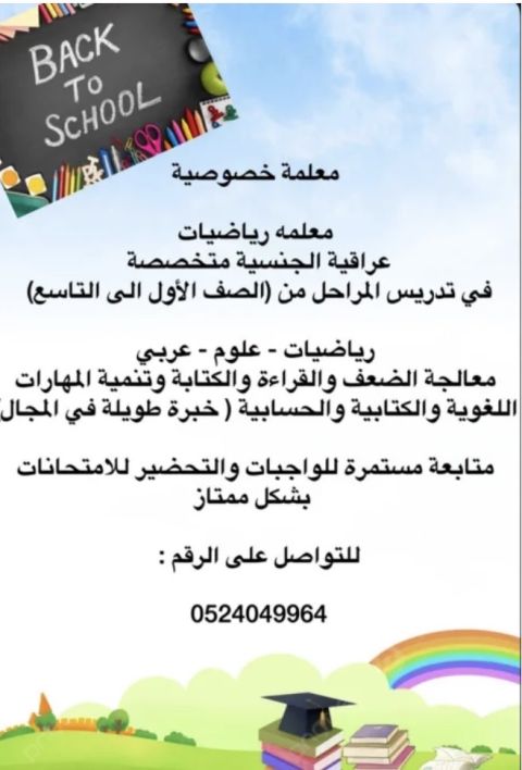 معلمه تأسيس ومتابعه لجميع المواد مع ملخصات وأوراق عمل للطلاب من KG وحتى Grade 10 تأسيس English Math Science لجميع المراحل التعليمية منهج وزاري / خاص / أمريكي / بريطاني / تكنولوجيا تطبيقية / شراكات وعسكرية متواجدة في العين للتواصل واتساب ومكالمات