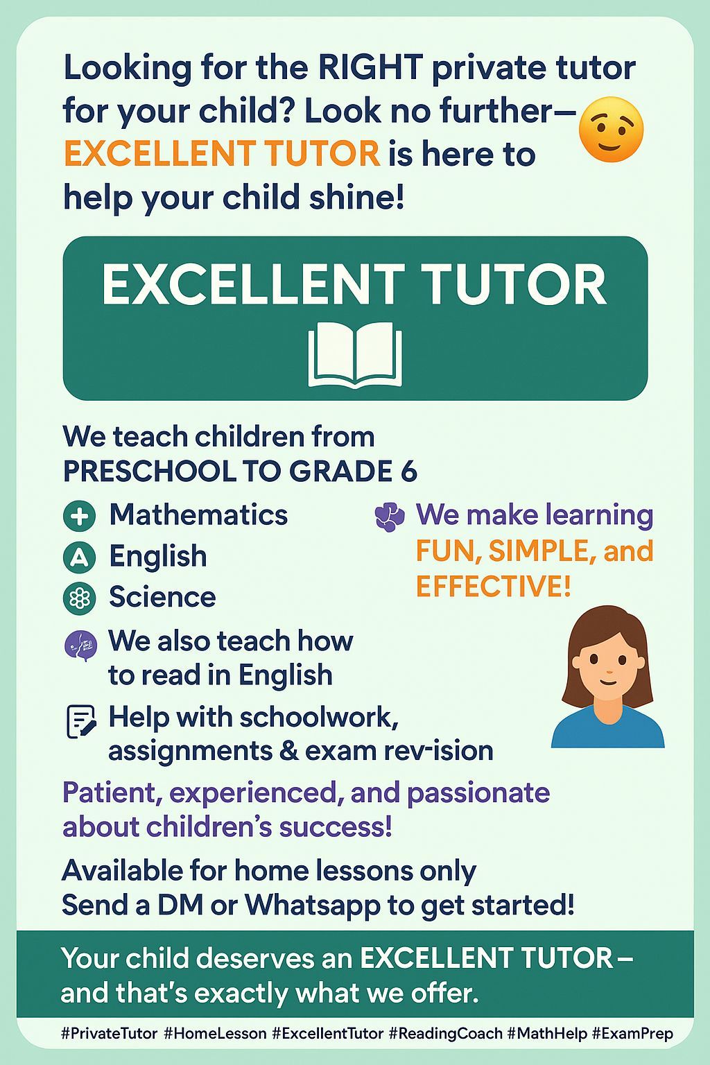 Excellent Tutor Where Learning Becomes Easy. We offer friendly one - on - one lessons in Math, English, and Science for children from preschool to Grade 6. We help with homework, reading, and exam preparation. Our patient and engaging approach builds confidence and improves grades