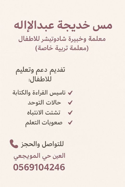 معلمة وخبيرة شادوتيشتر للاطفال (معلمة تربية خاصه) تقديم دعم وتعليم للاطفال تأسيس القراءة والكتابة حالات التوحد تشتت الانتباه