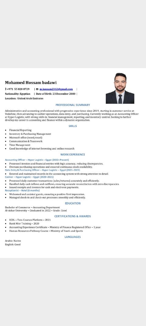 شاب جاد ابحث عن فرصة عمل مناسبة لدي خبرة سابقة في العمل كمحاسب، مدخل بيانات، وكاشير مع القدرة على تحمل ضغط العمل والالتزام التام بالمواعيد تسجيل الحسابات ادخال البيانات بدقة التعامل مع النقدية استخدام الكمبيوتر وبرامج الأوفيس حسن التعامل مع العملاء جاهز للعمل فورا، وأقبل الدوام الكامل أو الجزئي