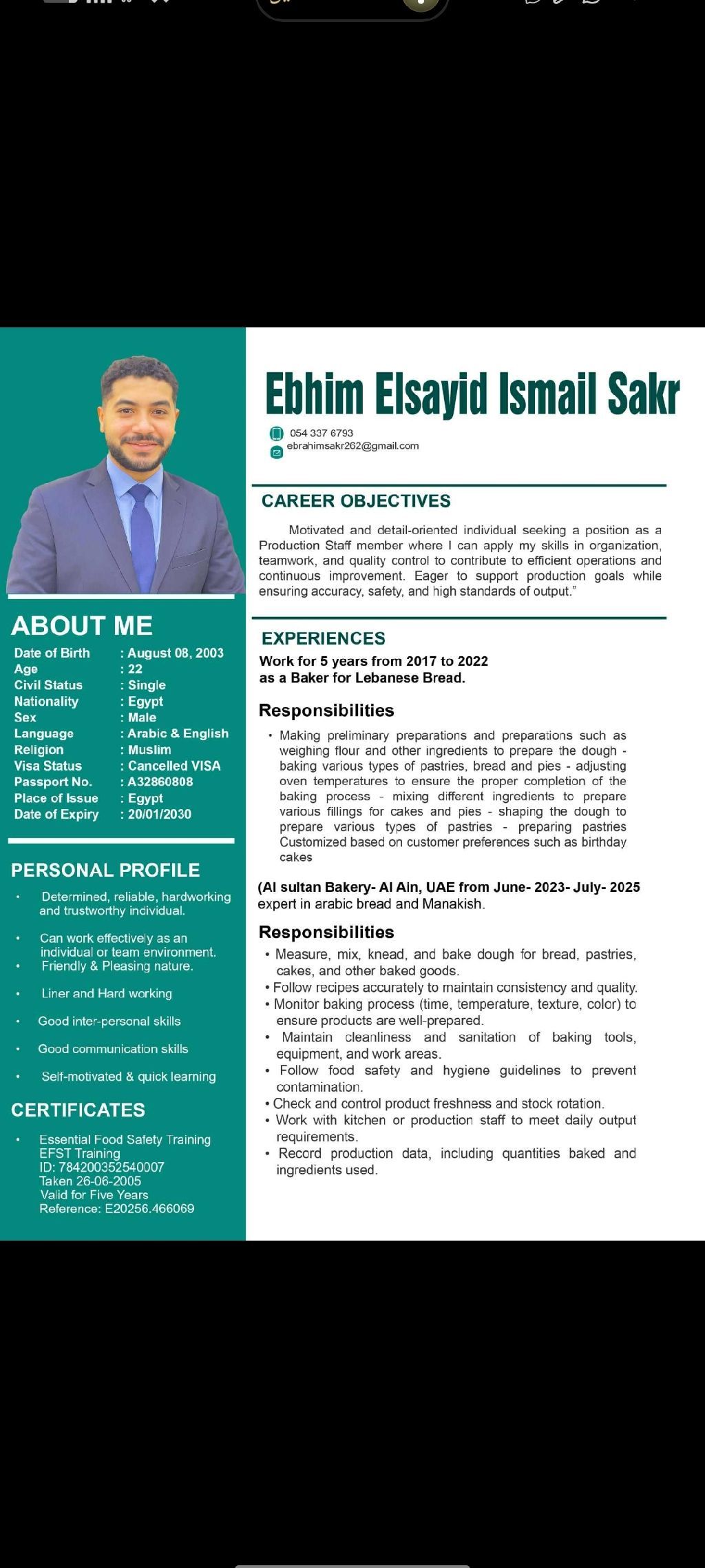 I am a baker specializing in Arabic bread, stone bread, Lebanese bread, barley bread, and bran bread. I am looking for work and have extensive experience in maintaining Lebanese bread machines. I have a valid residency permit