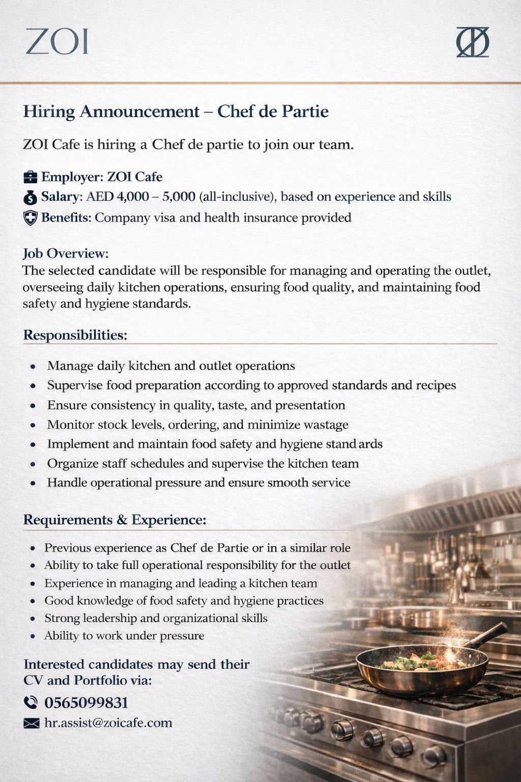 Hiring - Chef de Partie in Charge ZOI Cafe is currently looking for a Chef de Partie in Charge to oversee kitchen operations at one of our outlets in Al Ain. Role Overview The selected candidate will be responsible for managing day - to - day kitchen operations, supervising the team, ensuring food quality and consistency, and maintaining hygiene and food safety standards. Key Responsibilities Su