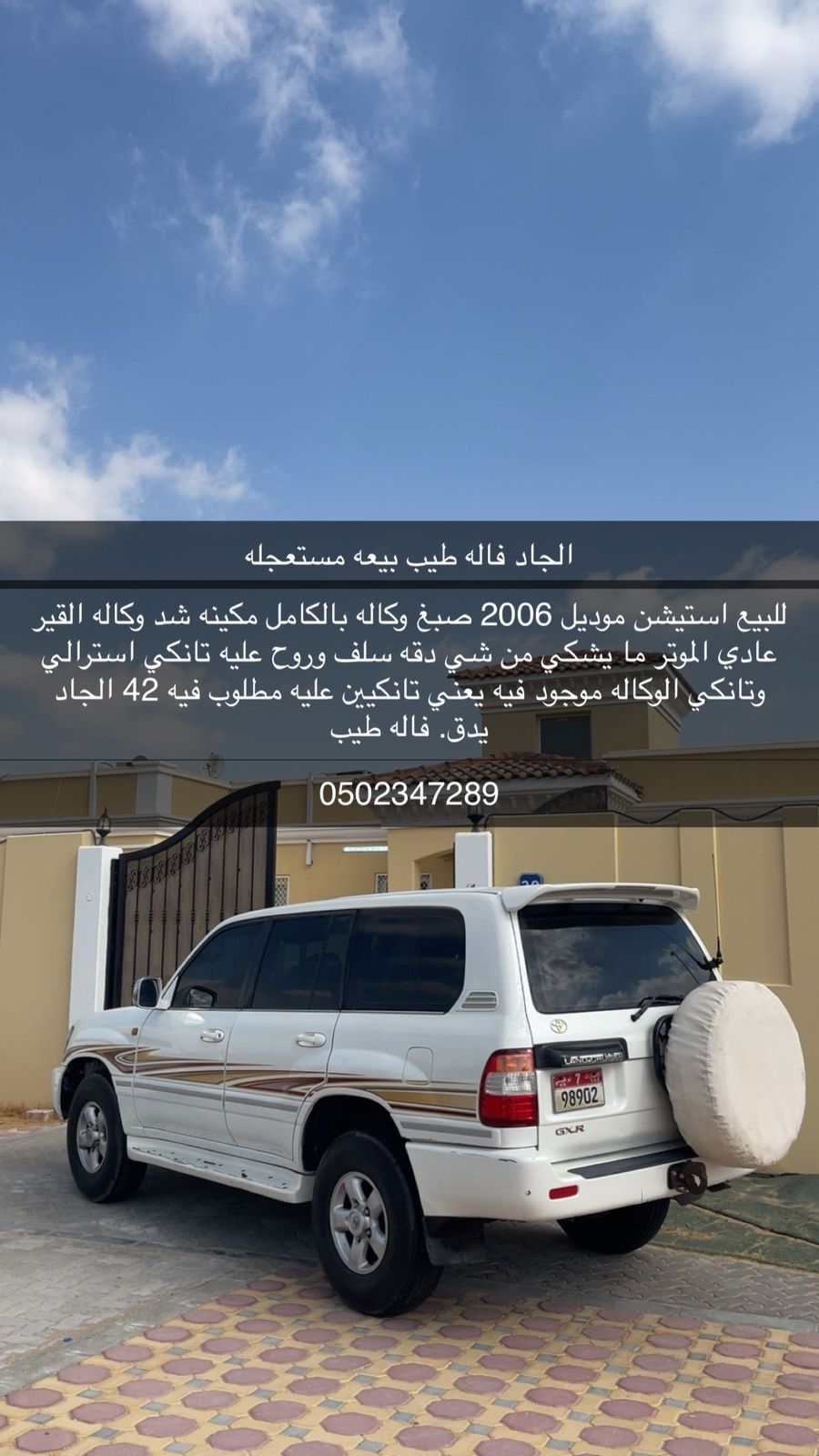 بيع مستعجل! لاند كروزر استيشن موديل 2006. صبغ وكالة بالكامل. الماكينة شد وكالة، الجير عادي. المحرك لا يشكو من شيء - دقة سلف وروح عليه. يحتوي على تانكي أسترالي وتانكي الوكالة (تانكين). المطلوب: 42,000 درهم. للجادين فقط.