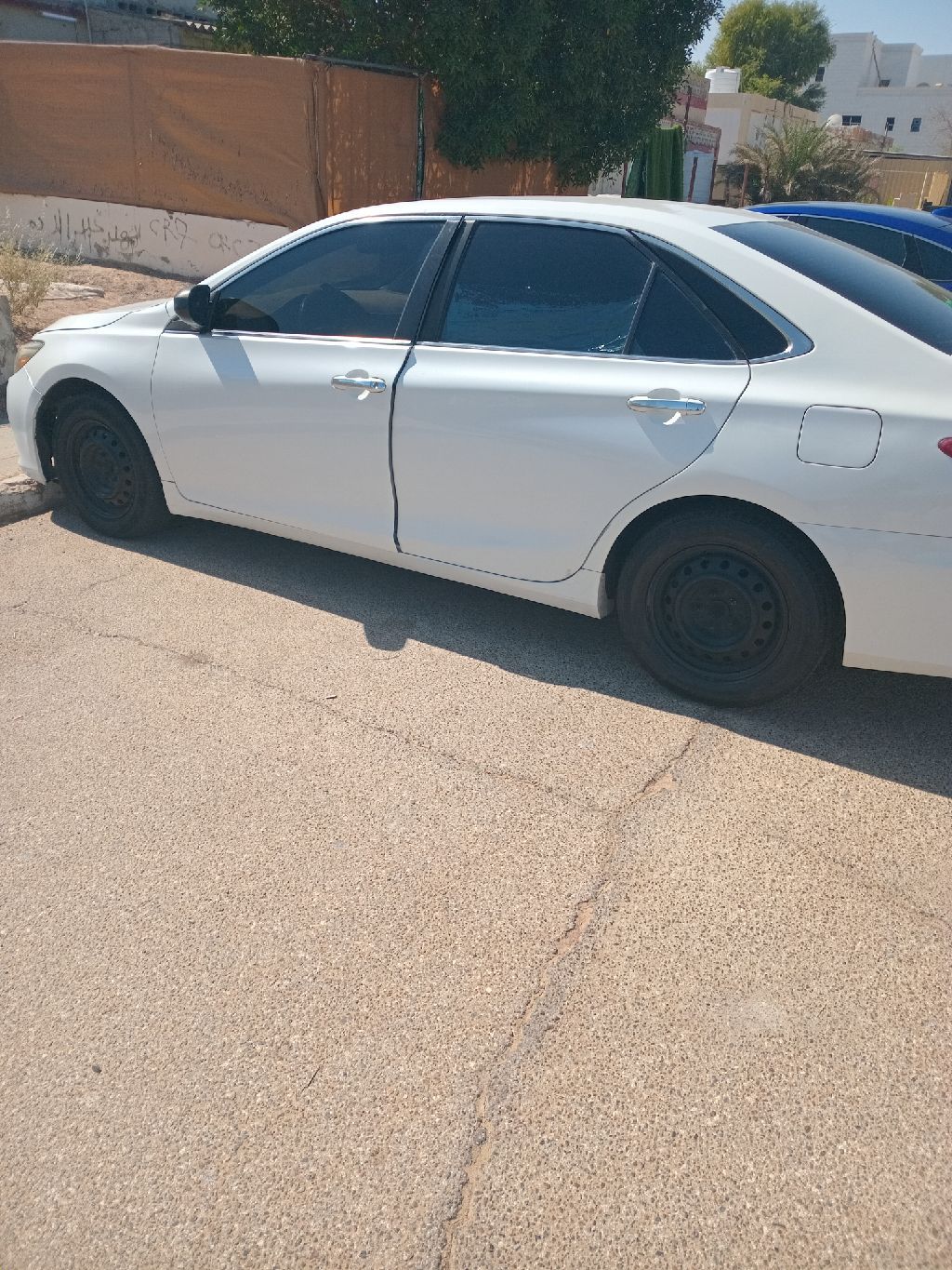 Toyota Camry for sale, 2017 model, white color, 4-cylinder, 2400 cc, with camera, cruise control, mileage 192,000 km, price 24,000 AED, inspection location: Al Khabisi, Al Ain.
