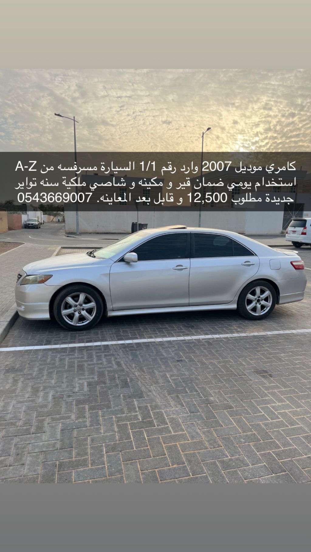 Camry model 2007, first owner. The car is serviced from A to Z, daily use. Warranty on gearbox, engine, and chassis. Ownership for one year. New tires. Asking price: 12,500, negotiable after inspection.