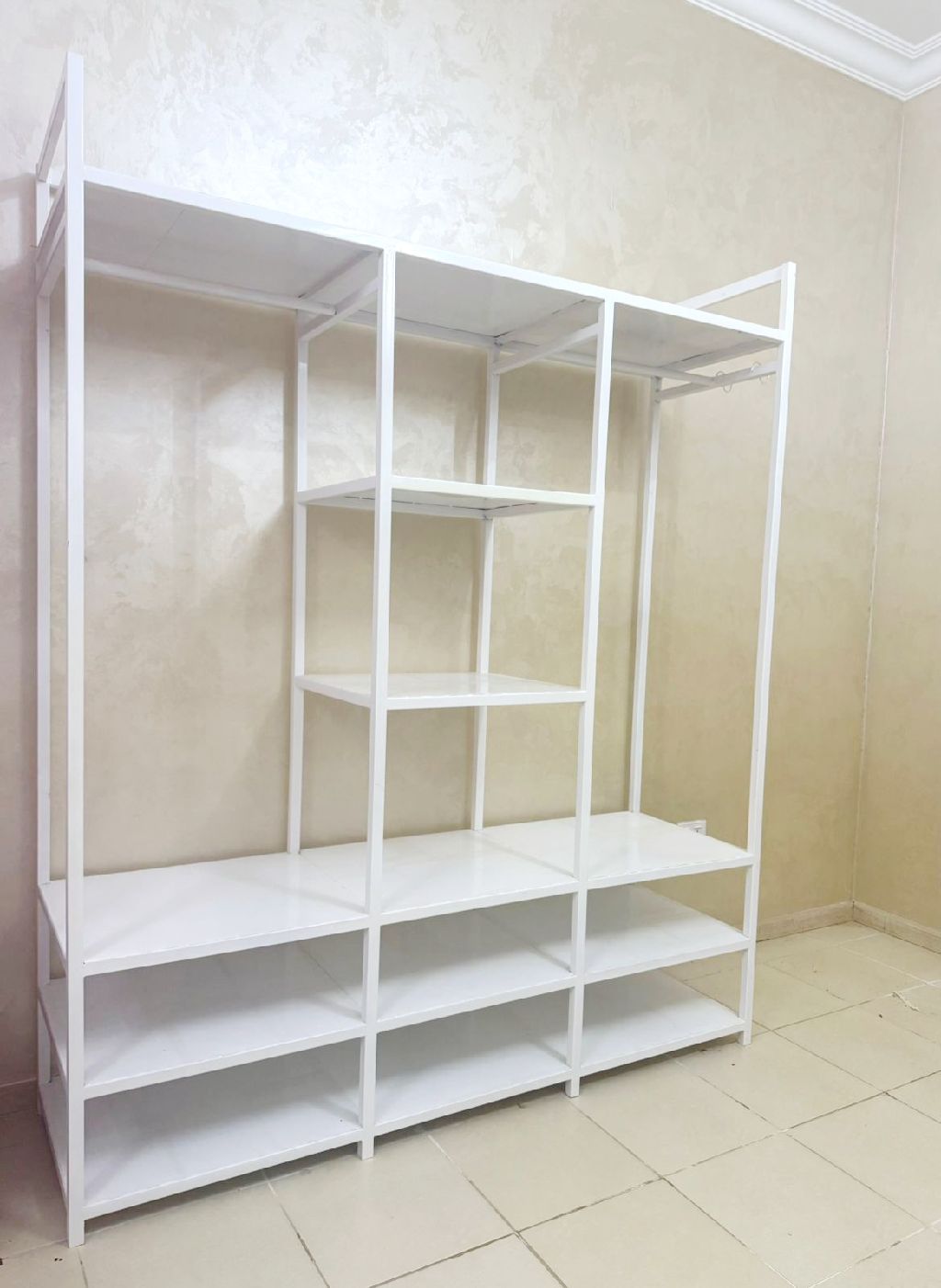 4 دواليب مفتوح أو وحدة تخزين مفتوحة (Open Closet/ Open Wardrobe) ستاند ملابس حديد اذا كان الغرض منه تعليق الملابس، خصوصا الجزء اللي فيه عمود للتعليق. ممكن يستخدم لتخزين الملابس، الأحذية، أو حتى التنظيم العام في الغرفة حسب احتياجك