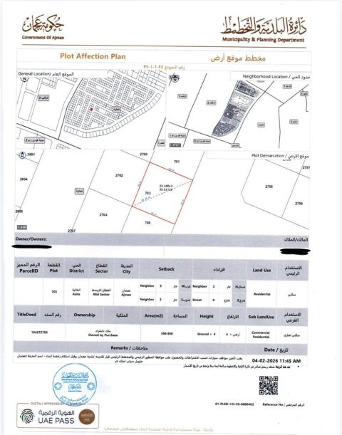 أرض للبيع في عجمان الموقع العالية (جلوبال المساحة 400م 2 الاستعمال الرئيسي سكني الاستعمال الفرعي سكني تجاري الارتفاع أرضي و4 طوابق التملك حر لجميع الجنسيات بوبدر شركة تسهيل العقارية