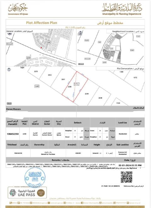 للبيع أرض سكنية تجارية مميزة في عجمان منطقة العامرة المساحة 672 متر مربع (حوالي 7233 قدم مربع) الاستخدام سكني تجاري (Commercial Residential) الارتفاع المسموح أرضي + 6 أدوار ( G 6)